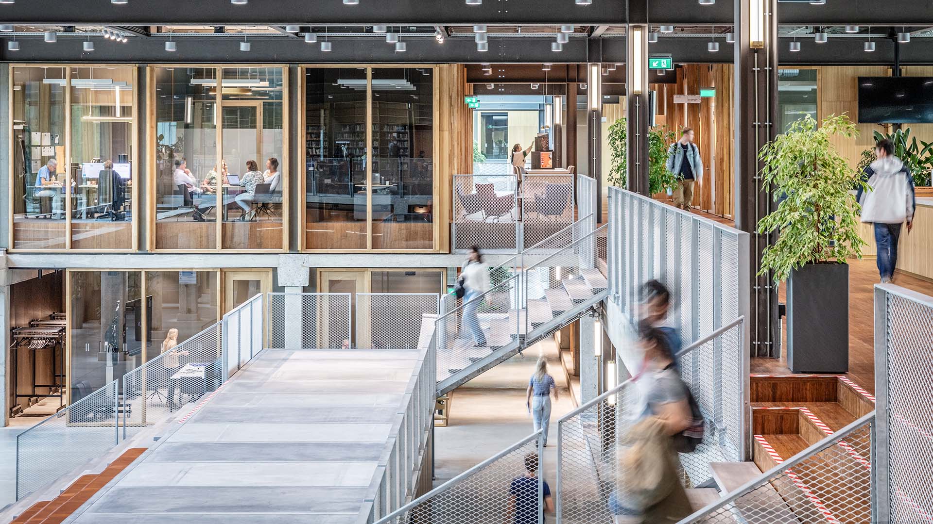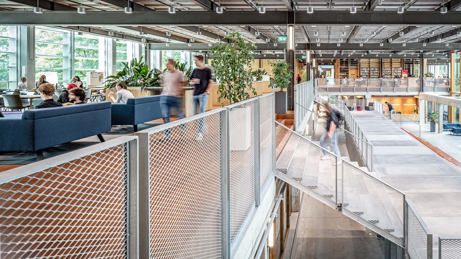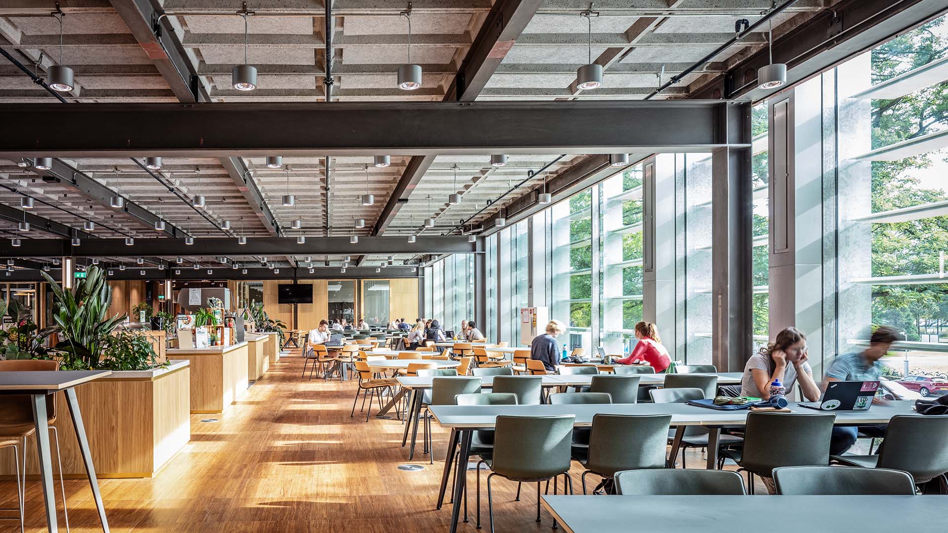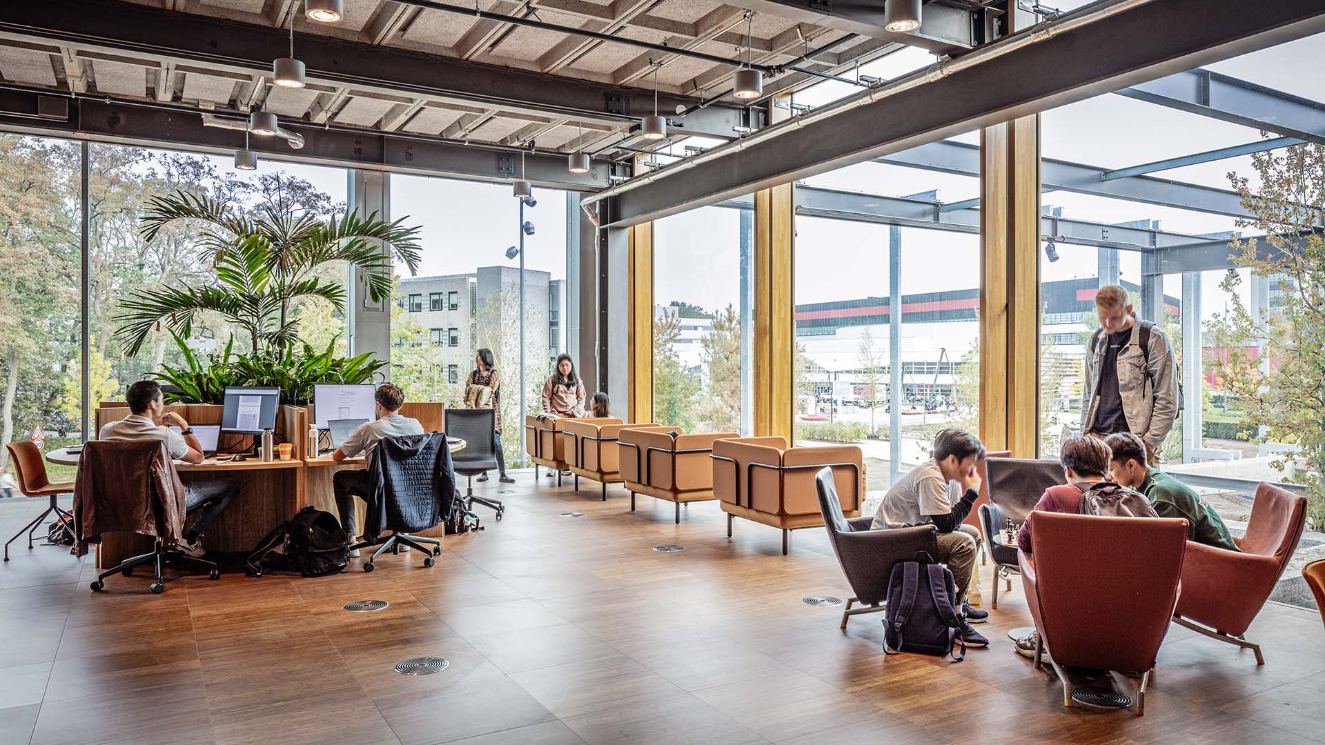 Samen met het ontwerpteam transformeerden we Langezijds tot een van de duurzaamste gebouwen op de campus. We verbeterden het energielabel van het pand van G naar A+++ en creëerden plekken voor onderwijsruimten, laboratoria, een groot studiecentrum, kantoren en een eet-werk-café. We plaatsten ongeveer 1.000 zonnepanelen op het dak. Je herkent de vroegere techniekhal aan de zichtbare rauwe beton- en staalconstructie. Vier atria – uitgezaagd uit de constructie – zorgen voor groen, verse lucht en daglicht en vormen kleine ecosystemen voor flora en fauna. De planten staan er in de volle grond, en regenwater loopt van de glazen daken zo de vijvers in.