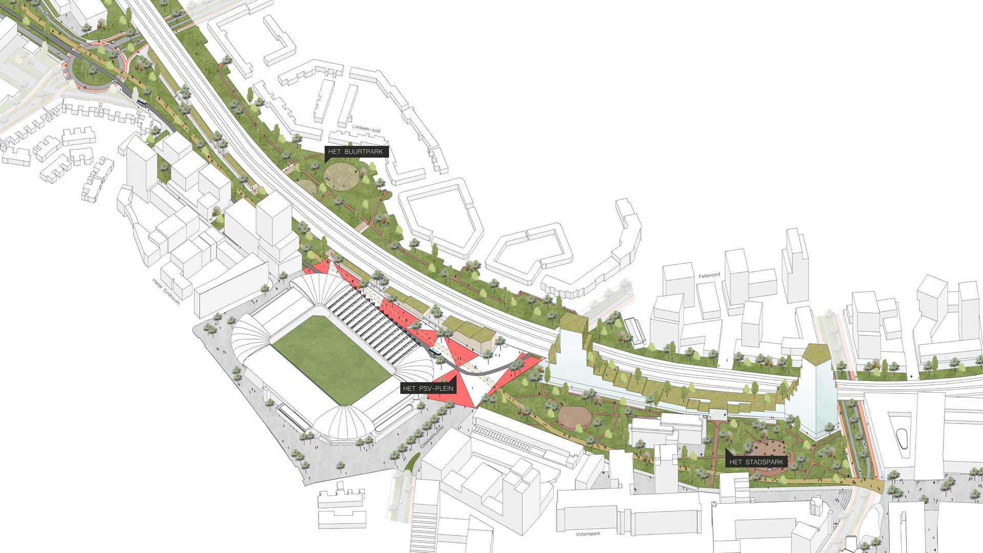 Na het Stadspark volgt het PSV-plein. Het drukke kruispunt voor het Philips Stadion verdwijnt doordat de verschillende verkeersstromen gescheiden worden. Waar de fietser en voetganger op maaiveld doorgang vinden, is de auto onder de grond geplaatst. Dit is mogelijk door de Elisabethtunnel te verlengen en de auto te weren op de Mathilde- en PSV-laan, waarmee het plein wordt vrijgespeeld. Het PSV-plein biedt ruimte aan supporters voor en na de wedstrijd, maar functioneert met haar pleinfunctie en de omliggende commerciële voorzieningen in de bebouwing aan het spoor ook goed op niet-wedstrijddagen.