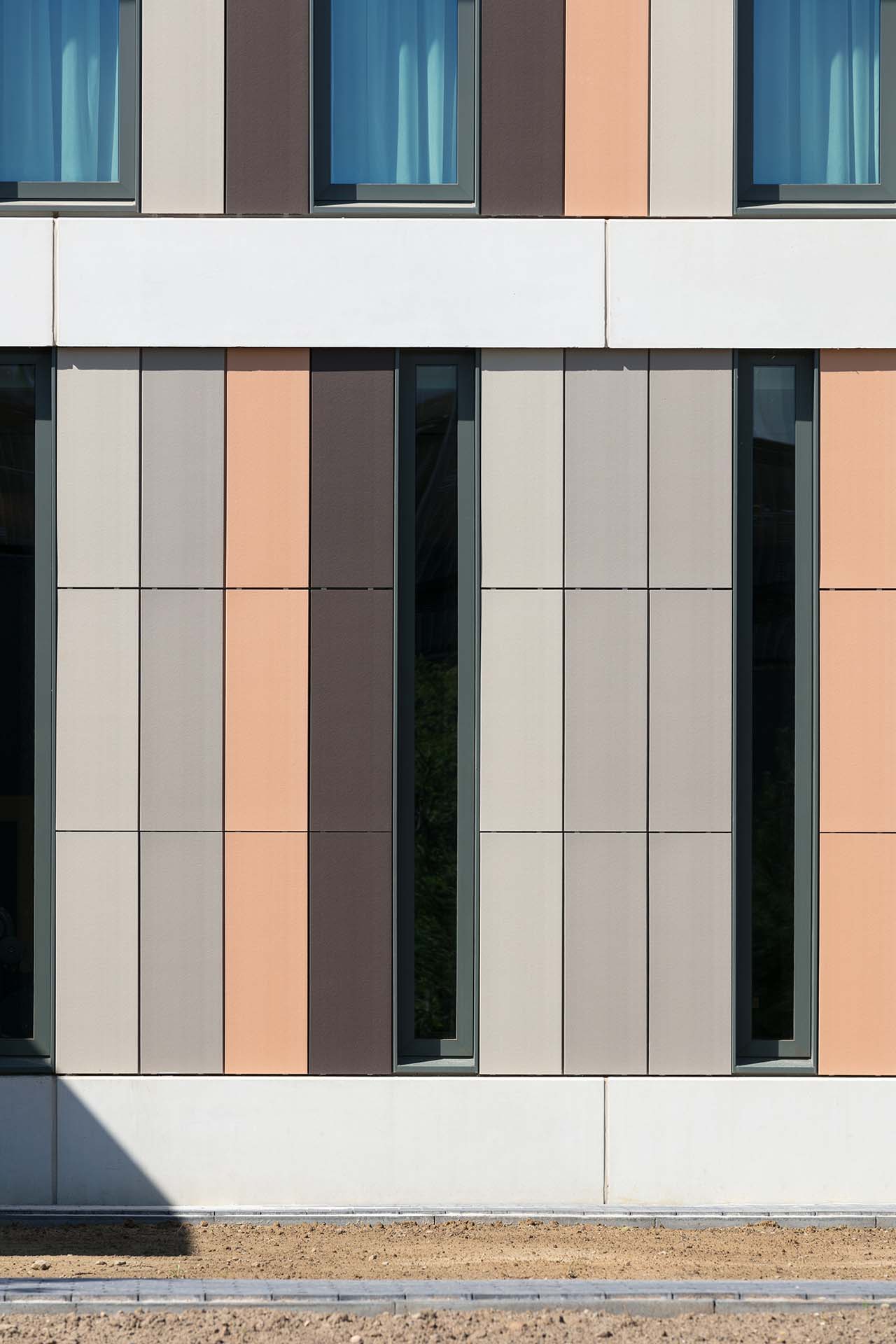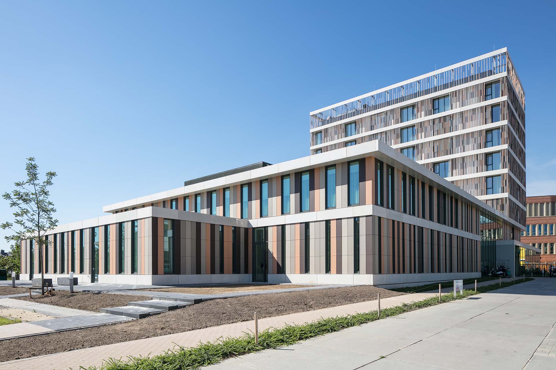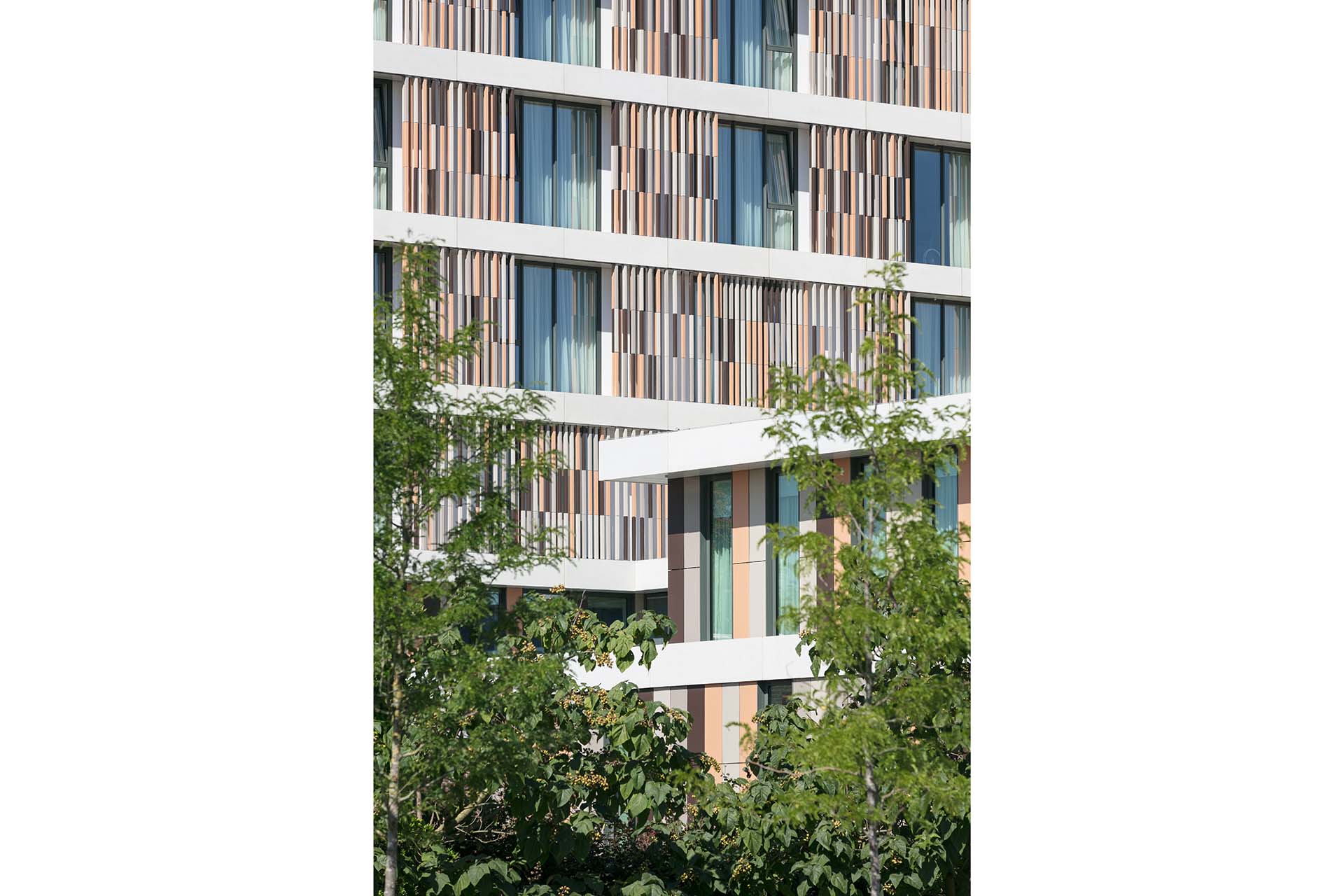 De bijzondere, elegante gevels zijn met een keramisch ‘gordijn’ bekleed, in een warme kleur die bij de lichte baksteen van de omringende gebouwen past.