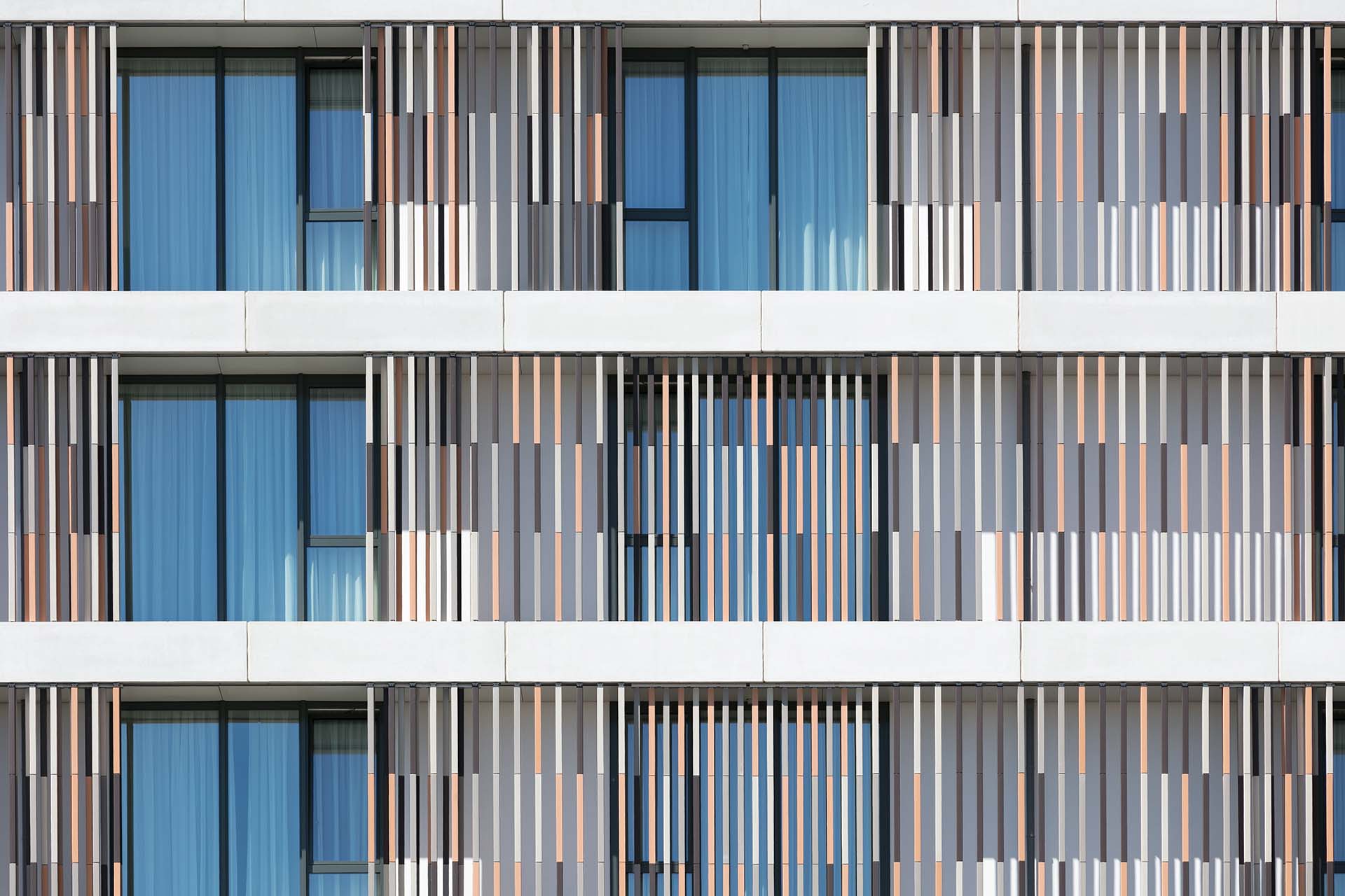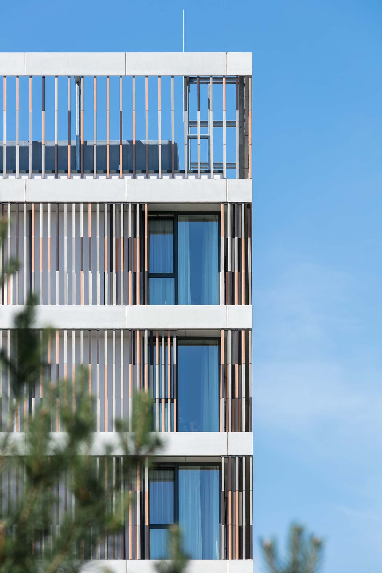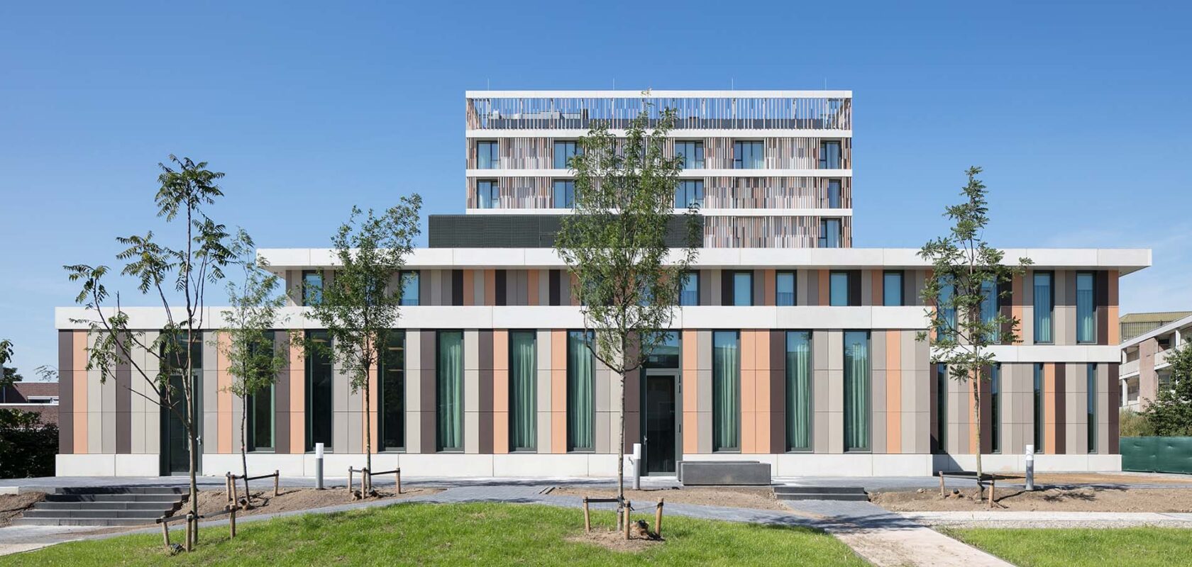 De bijzondere, elegante gevels zijn met een keramisch ‘gordijn’ bekleed, in een warme kleur die bij de lichte baksteen van de omringende gebouwen past.