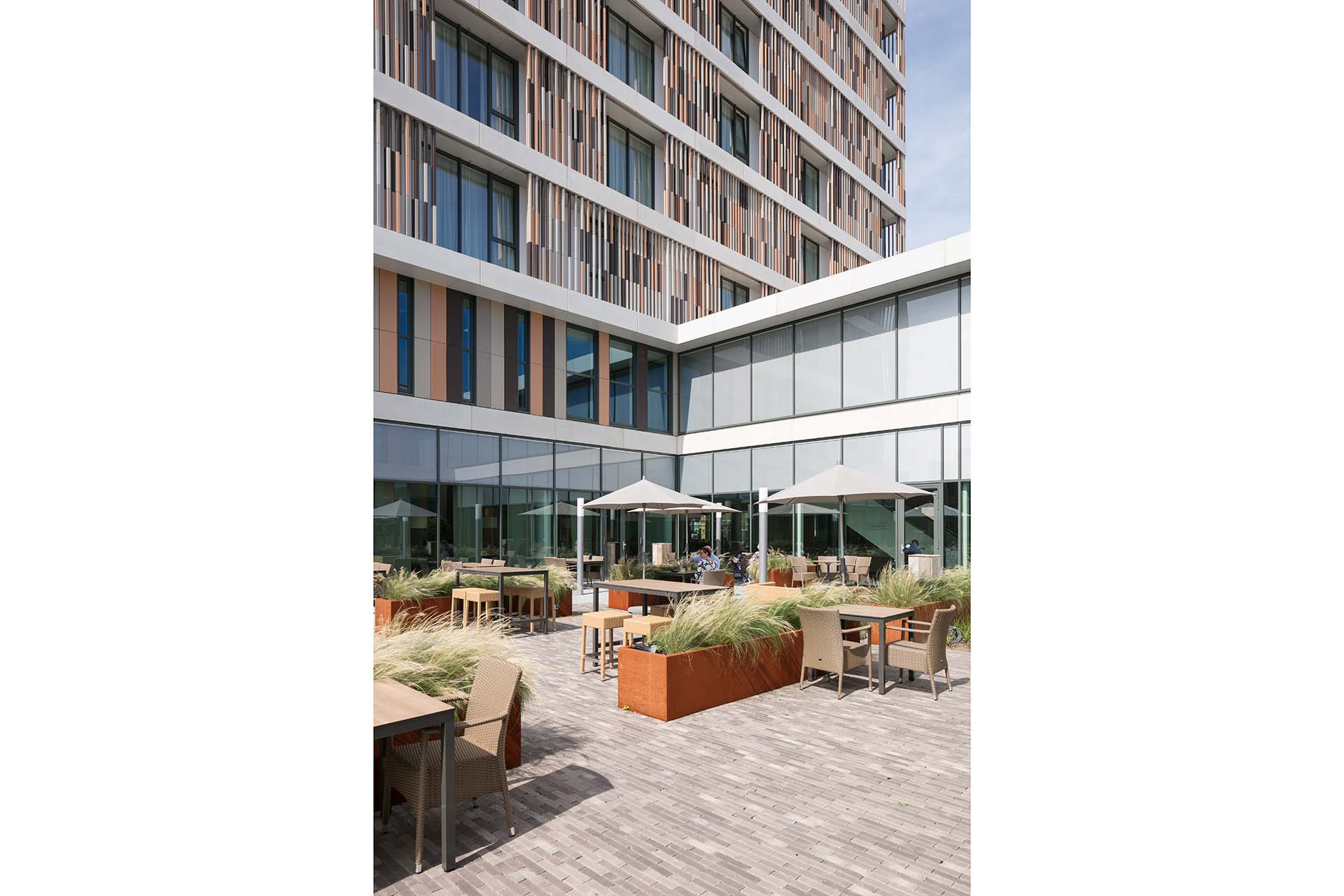 Sweco Architects ontwikkelde een totaalconcept voor het zorghotel met veel transparantie, waarbij binnen en buiten als het ware in elkaar overlopen. De bijzondere, elegante gevels zijn met een keramisch ‘gordijn’ bekleed, in een warme kleur die bij de lichte baksteen van de omringende gebouwen past. Binnen is er dezelfde warme sfeer met houten vloeren, een uitnodigende loungeruimte met comfortabele hoekbanken, een modern café en een chic restaurant met patio.
